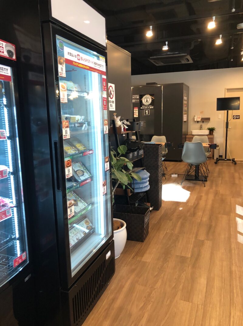 食べ物は自動販売機に簡単なお菓子があります。(お菓子は有料でアプリ決済のみ)