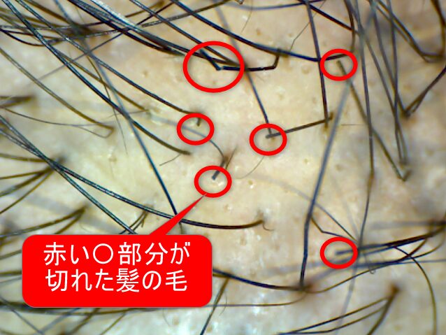 マイクロスコープで確認してみると頭皮側に髪の毛がきれた毛根側が残っていました。